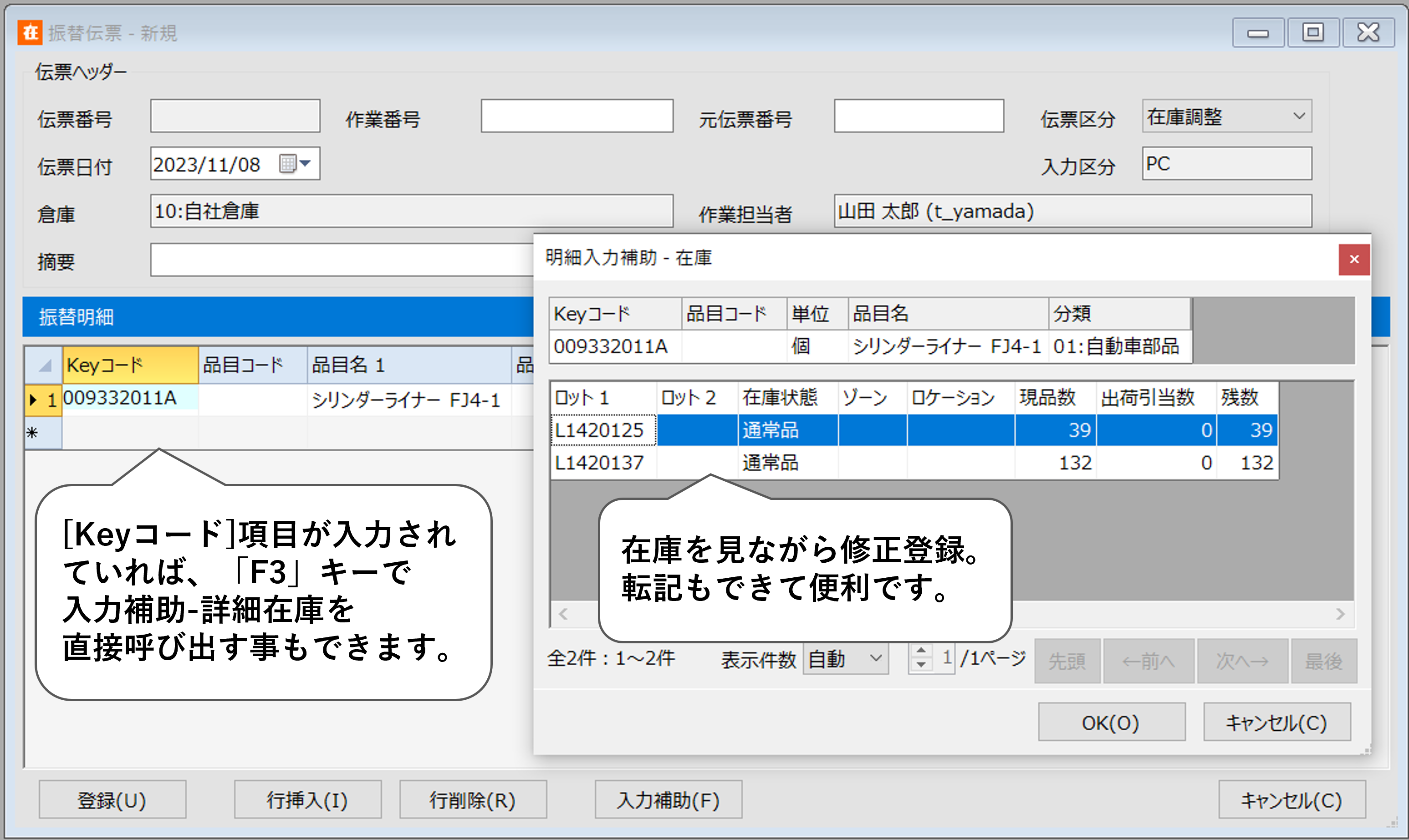 ここで、入力補助(PCの「F3」キー)にて在庫転記入力を利用すると、ロットやロケーションを入力する必要がなく、便利です。