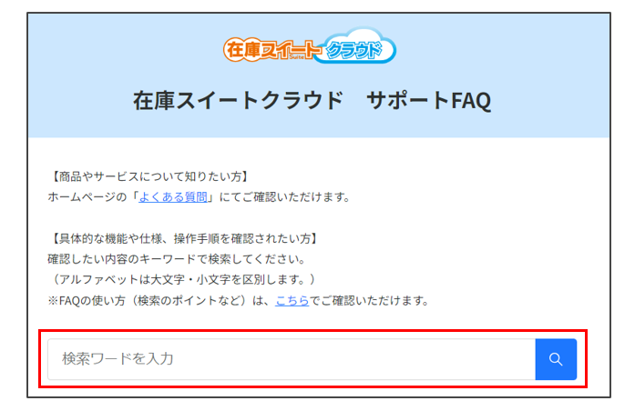 Googleなどの検索エンジンのように検索窓(赤枠の箇所)へ関連ワードを入力して、FAQを検索できます。